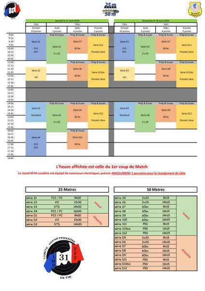 Vous avez le choix pour les séries P25/PPC à 25m (20 postes par série), Pistolet standard (20 postes par série), séries Pistolet VO (4 postes par série), séries Pistolet Libre à 50m (2 postes par série), séries Carabine 60 BC à 50m (4 postes par série), séries 3x20 à 50m (3 postes par série).